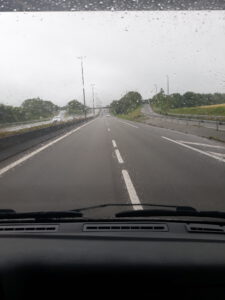 Vor uns hat gerade ein Auto von seinem Anhänger Erde verloren. Aber damit war der gute Herr noch nicht Hindernis genug, denn was macht der pragmatische und revolutionär veranlagte Franzose dann?! Er dreht auf der Autobahn um und fährt zurück zu seinem verlorenen Hab und Gut.
