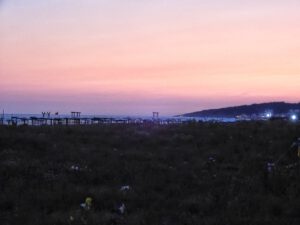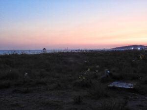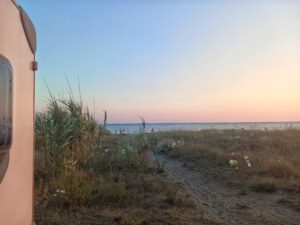 Am Platz angekommen öffnete uns ein dicklicher Herr die Schranke, lief dann aber vor uns weg, sodass wir nicht nach Preisen fragen bzw. uns anmelden konnten, also suchten wir uns selbst einen tollen Platz in erster Reihe aus, bestaunten den Sonnenuntergang und dachten: Es wird schon jemand kommen und uns das Geld abknöpfen! Und so war es auch.