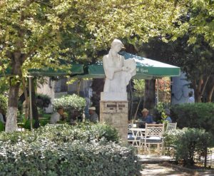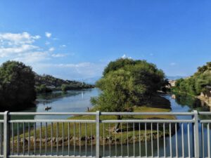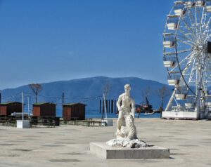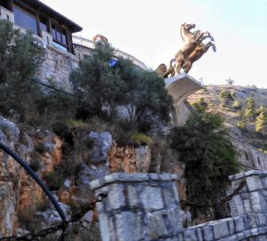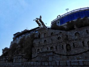 Während unserer Abreise fuhren wir erneut durch viele kleine und große Städtchen, die alle ganz zauberhaft waren, mit unzähligen Figuren und Denkmälern, u.a. für Marigo Posio, aber dazu ganz unten mehr. Weniger zauberhaft war die Verkehrslage rund um Vlora und Durrës. Allerdings versüßte uns ein kleines albanisches Mädchen im Auto vor uns die Fahrt. Sie steckte immer wieder ihren Kopf aus dem Fenster und lächelte verlegen, wenn wir lächelten. Dann steckte sie plötzlich den Kopf raus und fing an auf einer Kinder-Blockflöte zu Pfeifen. Keine Melodie, einfach Töne. Aber alle drum herum, inklusive uns, mussten darüber grinsen.