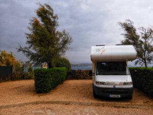 Bevor wir den Stellplatz anfuhren, haben wir erst das Womo nochmal geleert und betankt. Abwasser raus, aber kein Frischwasser rein, denn das haben wir ja auf dem Platz… oder doch nicht? Denn als wir bei D015, unserem „Premiumplatz“ ankamen, mussten wir enttäuscht feststellen, dass er zum einen nicht so groß ist, wie der Premiumplatz, den wir beim ersten Aufenthalten hatten. Daführ hatten wir eine umso größere Mauer zwischen Meer und Womo. Sprich: ein Platz mit Meer… äh Mauerblick. Außerdem befand sich der Strom- und Frischwasseranschluss auf dem benachbarten Platz. Es ist zwar üblich, dass sich zwei Plätze die Anschlüsse teilen, aber normalerweise befindet sich der Anschluss dann genau zwischen den beiden Plätzen, sodass jeder von seiner Seite aus dran kommt. Hier war das nicht der Fall. Ich musste über den Platz der Nachbarn, um zum Anschluss zu kommen und dann unser Kabel über die Hecke verlegen. Premium stellen wir uns anders vor.