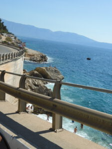 Am Platz angekommen stellten wir fest, dass dieser wohl entweder nicht mehr existiert oder die GPS-Daten nicht stimmten. Also drehten wir um, beobachtete eine Frau die ihren Sohn vom Baden abholte und ihren Mercedes drehte, als sei es ein Panzer. Nach mehreren Versuchen hat sie es dann geschafft, den Parkplatz zu verlassen und wir fragten uns, wie sie bei diesen Chaoten auf der Straße und dem eigenen unsicheren Fahrstil überhaupt überleben kann. Egal, weiter gings.