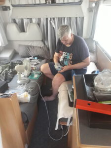 Ganz nebenbei erwähnt, reichte es Juergen scheinbar, dass die ganze Aufmerksamkeit auf meinen Verletzungen lag, so hat er sich beim super schlauen Versuch zu testen, ob unsere Schere noch scharf ist, in den Finger geschnitten. Das ist noch cleverer als nachts in Badelatschen einen Hügel runter zu klettern. Weil ihm das nicht reichte, hat er sich dann noch beim Aufschütteln der Decken die Hand so hart am Türgriff geschlagen, dass wir kurzfristig dachten, er habe sich was gebrochen.
