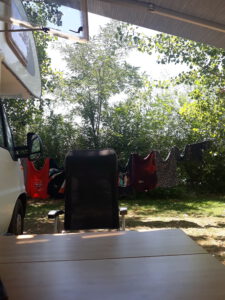 Viel mehr ist gestern dann auch nicht passiert. Ebenso Ereignislos war der heutige Tag, an dem wir einen leckeren Gurken-Zucchini-Salat gemacht haben (Danke an Brigitte für das Rezept) und den Platzwarten dabei zugesehen haben, wie sie recht rabiat zuerst alle (halbwegs) freien Flächen gewässert und dann gemäht haben. Zum Glück hatten wir vorsichtshalber die gerade frisch gewaschene Wäsche in Sicherheit gebracht, sonst hätten wir diese morgen nochmal waschen können. Heute Vormittag haben Mainzer und Potsdamer den Platz verlassen (die Welt ist echt ein Dorf) und dennoch sind wir umzingelt von Deutschen. Neben uns, hinter uns, überall.