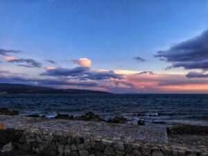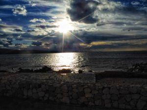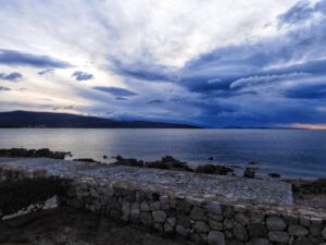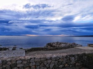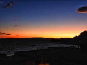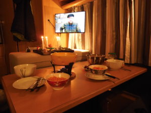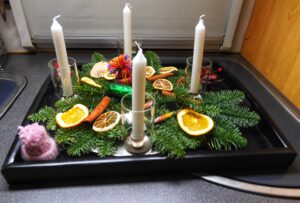 Wir waren bis zum frühen Abend beschäftigt und stellten dann fest, dass wir ja mal Frühstücken könnten. Nach kleinem Snack und kurzem Pausieren setzten wir uns an die winzige Weihnachtsstimmung auf unserer Weihnachtsmuffeltour. Juergen dekorierte einen Adventskranz, ich habe lediglich eine Kerze befestigt. Auf dem Bild könnt ihr sicherlich erkennen, welche die meinige war. Hust… Das erklärt auch, warum ich beim restlichen Dekorieren nur Zuschauer war. Anschließenden deckten wir den Tisch und bereiteten ein Käsefondue zu. Alles was dafür notwendig ist, haben wir an Bord, da wir von Kroatien aus direkt nach Brandenburg an der Havel fahren, um dort Silvester bei eben diesem Käsefondue zu verbringen.