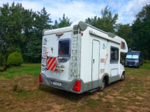 Lange Rede, kurzer Sinn: Wir wollten am 6. August starten, das Wohnmobil in der Werkstatt abholen und von dort aus in den Urlaub fahren. Aber nachdem die Bude aufgeräumt war (damit die Nachbarinnen beim Wohnungs-Sitten keinen Schock bekommen) und das Auto beladen war, war es schon wieder so spät, dass wir uns dazu entschieden haben, am Folgetag morgens zu starten. Das traf sich insofern gut, als dass sich unser neuer Nachbar aus der Tiefgarage ausschloss und wir ihm so noch mitten in der Nacht aus der Patsche helfen konnten und wir darüber hinaus online ein Angebot für einen gebrauchten E-Scooter entdeckten, der unschlagbar günstig in Hellersdorf zum Verkauf stand. Da ich bei Womo-Touren als Nicht-Fahrradfahrer mobiler sein möchte, haben wir seit Längerem nach Rollern Ausschau gehalten. Gesagt getan, wir also morgens nach Hellersdorf, um den giftgrünen Roller abzuholen und weiter zur Werkstatt. Erste Roller-Testfahrten waren mehr als gewöhnungsbedürftig. Das bedarf definitiv noch der Übung und vor allem eines Helms.