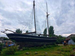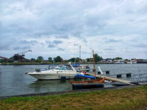 Aber zurück zur eigentlichen Fahrt: Wie gesagt wollten wir einen Platz anfahren, um alles aufzufüllen und zu leeren. Der ausgewählte Stellplatz war schön gelegen an einem Hafen, mit süßem Imbiss in einem Bötchen, namens „Zum dünnen Hering“, aber auch hier: eigentlich vergleichsweise günstig für ca. 28 Euro, aber keiner mehr da zur Anmeldung. Der Platz ein Acker. Bei der einfahrt ein großes Schild mit Befehlen. „Verhalten Sie sich so… unterlassen Sie dies… und wer nach 17 Uhr ankommt, hat trotzdem den vollen Tag, am Folgetag umgehen zu entrichten. Hierfür finden Sie sich zum Beginn der Öffnungszeit unaufgefordert in der Anmeldung ein“ – Äh, wir finden uns unaufgefordert auf dem süßen Parkplatz am Hafen ein, der direkt neben dem Womo Platz liegt, kostet auch nur fünf Euro pro Nacht. Klar, wieder „wild“ ohne Wasser, Strom und co, aber dieser DDR-Befehlston, nein danke!