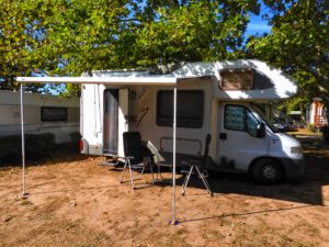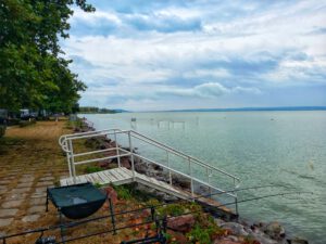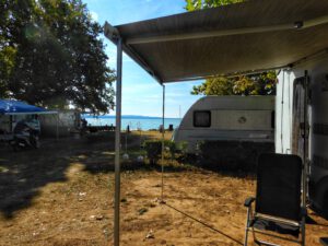 Leider ist der Platz am Balaton nur in erster Reihe zum See wunderschön, so wie wir 2022 standen. In der Mitte, wo wir nun stehen mussten, da so kurzfristig in erster Reihe nichts frei war, ist der Platz halt auch nur noch so mittel. Egal… Frischwasser tanken, Grauwasser ablassen, Chemie-WC leeren und ab auf den Platz. Ankommen, Füße hochlegen und bei Bier den Nudelsalat genießen. So war zumindest der Plan. Aber da wir direkt unter einem recht niedrigen Baum standen konnten wir unsere Schüssel nicht ausfahren. Sprich: nix TV.